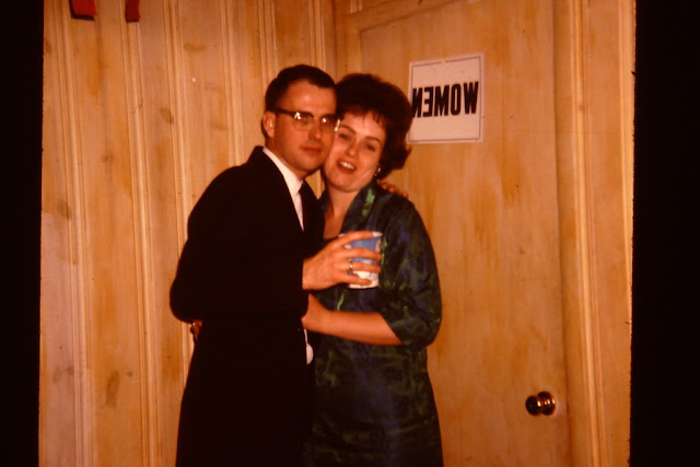 Here's my Dad, so handsome with his suit and skinny tie with a woman who is not my mother, slipping her hand inside his jacket. I'm not sure what that's about, but in every, single picture of the grownups from those days, they're all partying and carrying on, like, "YES! The Catholics have been set free from our freakin' packs of kids for a few hours. Let the Wild Rumpus Begin!" I guess we didn't scan any pics of all the pregnant women with their smokes in one hand and cocktails in the other, but let me just say, there's a ton of proof out there to why my math skills are abysmally poor. And yes, I know the slide is backward, but I'm too lazy to fix it. OK?