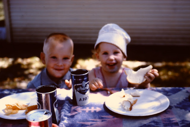 Here are my brother and I having a nutritious lunch. Note the generic sodas with the lids completely cut off. Better to gulp it down that way.