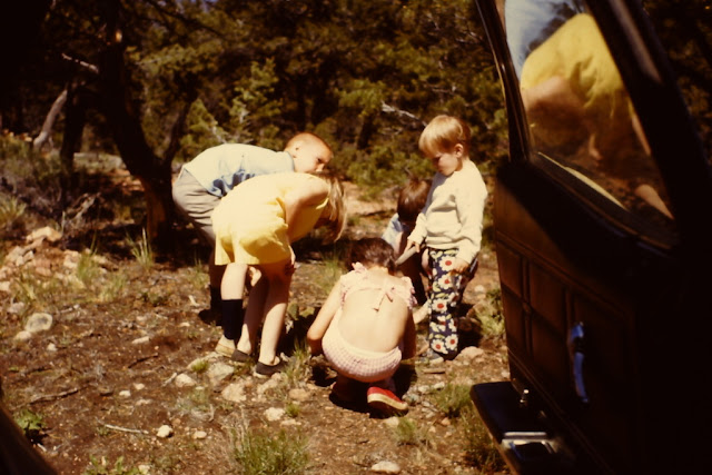 My siblings and I, on the side of the road on a vacation in Colorado. I don't know who thought it was a good idea to dig up a cactus to take home as a souvenir. My parents were all for it, pulling over, so that we could get thousands upon thousands of tiny little prickly things under our skin for a pleasurable, lengthy journey in the station wagon back to Illinois. Utter misery.