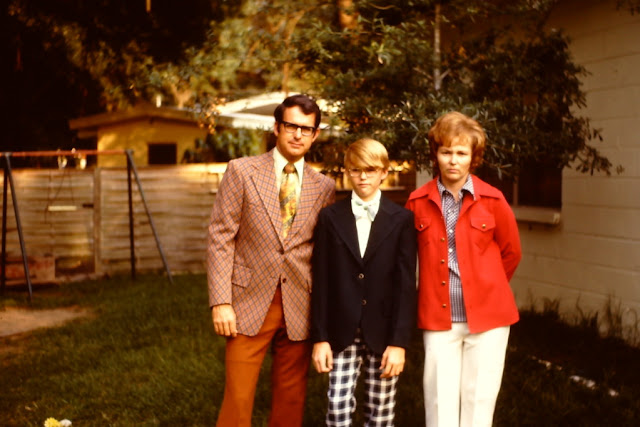 This next one, my sister and I lingered on for the longest time while slide-viewing. This picture of my parents and my brother is quite simply, astounding. I think our family fashion statement was, "Close your eyes when picking out a look, that way you scream, 'I'm a Clash Queen and proud of it, Beyatch!'" Seriously, what the hell? Can one get any more patterns and colors in one outfit?